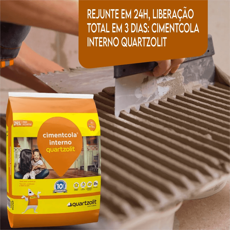A Argamassa Quartzolit Cimentcola Interno ACI Cinza - 20kg é perfeita para o assentamento de revestimentos cerâmicos em áreas internas, garantindo alta aderência e excelente acabamento. Sua formulação de qualidade proporciona fácil aplicação e resistência, ideal para quem busca praticidade em pequenas obras ou reparos. Com secagem uniforme e forte fixação, assegura durabilidade e desempenho superior nas instalações.