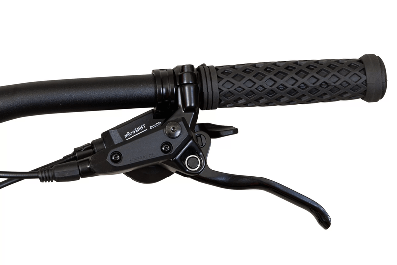 Câmbio Microshift XLE 2x10 Velocidades com Estabilizador. Trocas precisas e suaves, mesmo em terrenos irregulares. O estabilizador de corrente reduz impactos no quadro e aumenta a durabilidade do sistema.