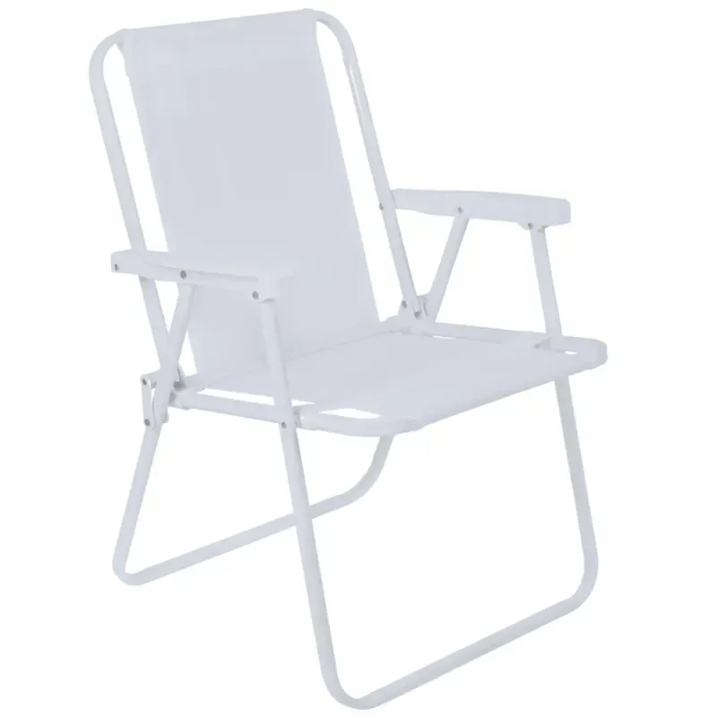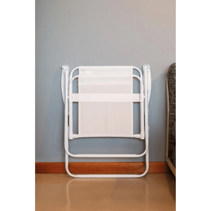 Sua estrutura em tubos de aço com pintura epóxi a pó branca garante alta resistência e durabilidade, suportando até 110 kg. O assento em tela de polietileno, também na cor branca, proporciona conforto e é fácil de limpar, enquanto os apoios de braço em polipropileno oferecem maior comodidade durante o uso.