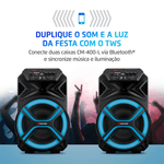 Com Bluetooth 5.3, a conexão é mais rápida, estável e sem interrupções. Já a função TWS permite conectar duas caixas CM-400-L sem fio, duplicando o som e sincronizando as luzes para uma festa ainda maior.