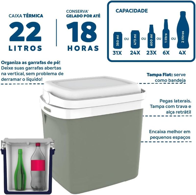 E ideal para quem busca praticidade e eficiência na conservação de alimentos e bebidas em viagens, passeios, pescarias ou momentos de lazer. Fabricada em material resistente e com excelente isolamento térmico, mantém a temperatura interna por muito mais tempo, garantindo produtos sempre frescos. Seu design moderno conta com tampa reforçada, trava de segurança. Seu tamanho compacto a torna fácil de carregar.