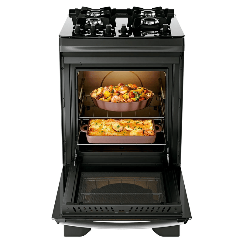 Seu forno de 60 litros, com excelente isolamento térmico e luz interna, garante assados uniformes e saborosos. O visor amplo permite acompanhar o preparo sem abrir a porta, mantendo a temperatura ideal.
