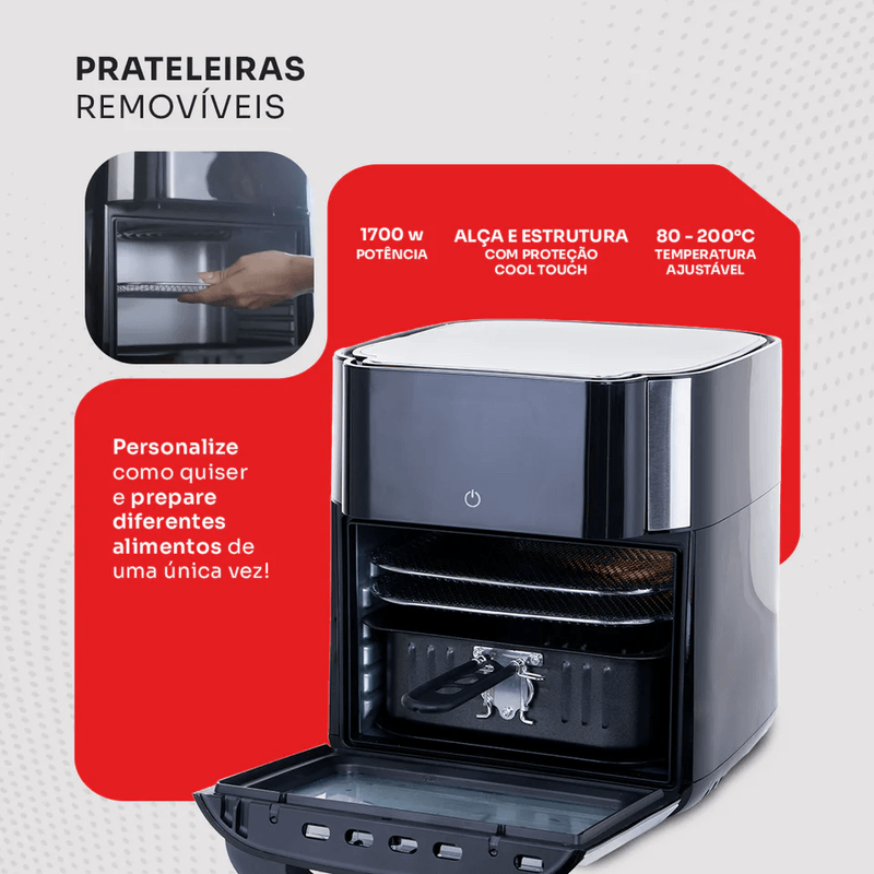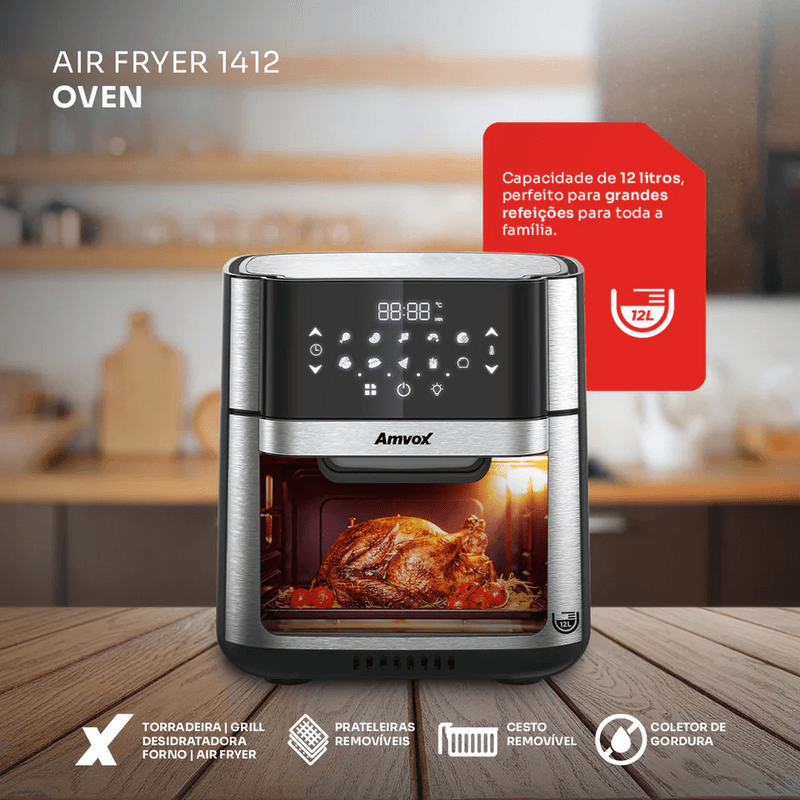 Com capacidade generosa de 12 litros, é perfeita para preparar desde pequenas porções até refeições completas para toda a família. Suas funções multifuncionais permitem assar, grelhar, torrar e desidratar, oferecendo versatilidade total na cozinha.