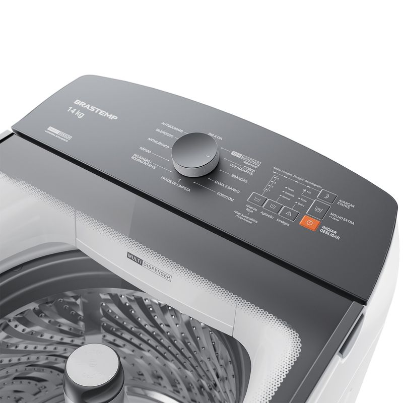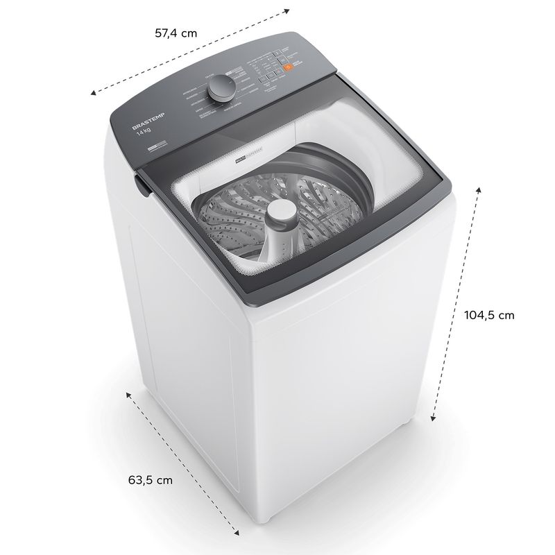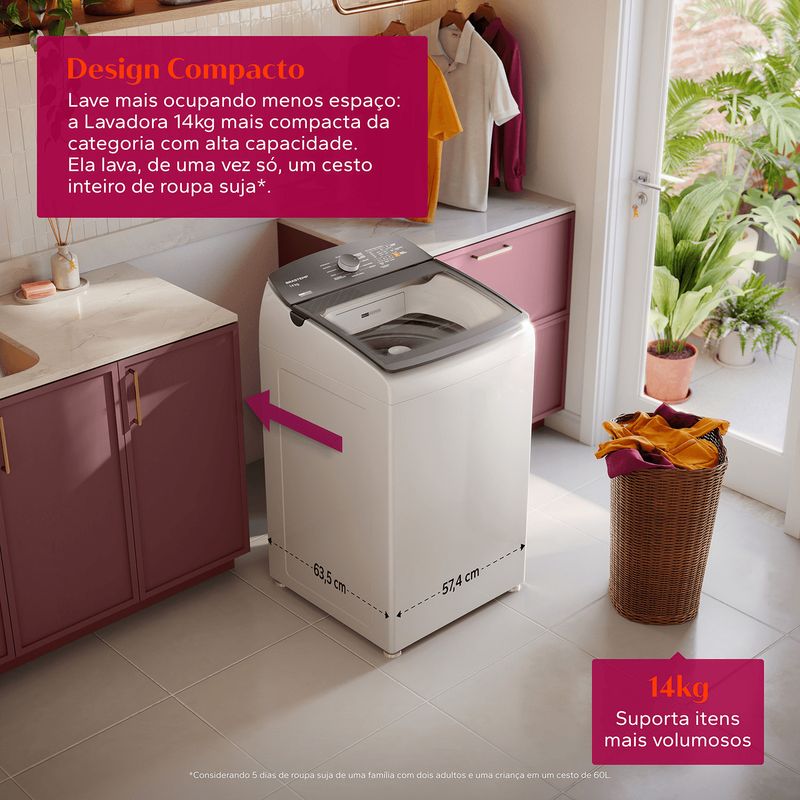 Design Compacto – Mais capacidade em menos espaço. Lave muito mais ocupando menos espaço. A Lavadora Brastemp 14kg é a mais compacta da categoria, sem abrir mão da alta capacidade. Lava um cesto inteiro de roupas de uma só vez, ideal para famílias e rotinas intensas, adaptando-se perfeitamente ao seu ambiente.