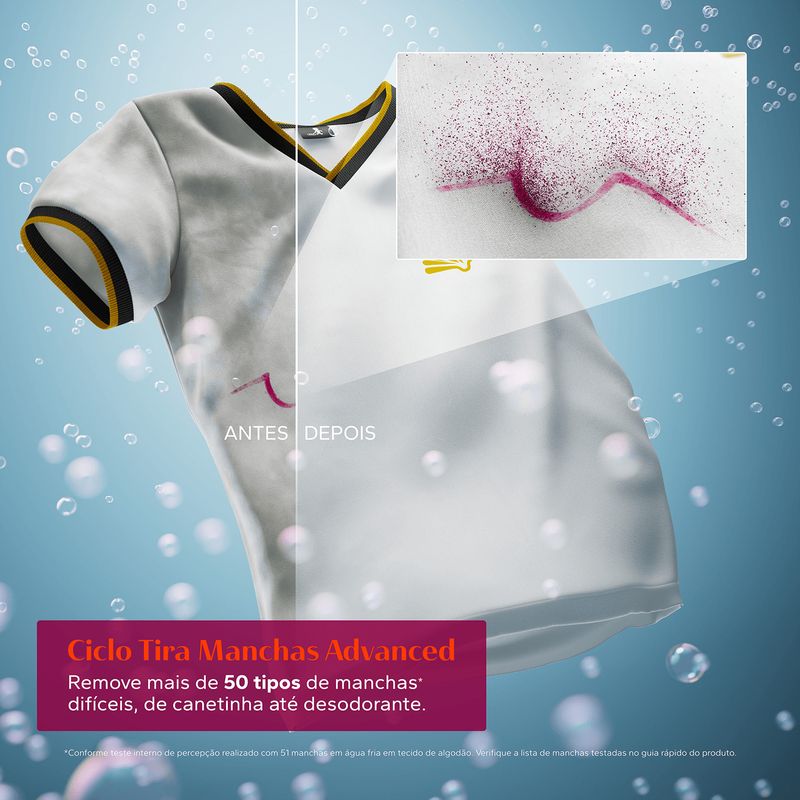 Ciclo Tira Manchas Advanced. Tecnologia exclusiva de molho e agitação que remove mais de 50 tipos de manchas difíceis, como canetinha, desodorante e até aquelas manchas secas que parecem impossíveis de sair. Roupas limpas e renovadas, sem esforço extra.