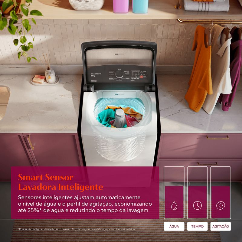 Smart Sensor – Inteligência que trabalha por você. Uma lavadora que pensa e faz por você. Os sensores inteligentes identificam automaticamente o peso das roupas e ajustam o nível de água e o perfil de agitação, garantindo a melhor performance em cada lavagem. Resultado: até 25% de economia de água e ciclos mais rápidos, com máxima eficiência. O futuro da lavagem dentro da sua casa.