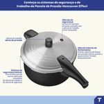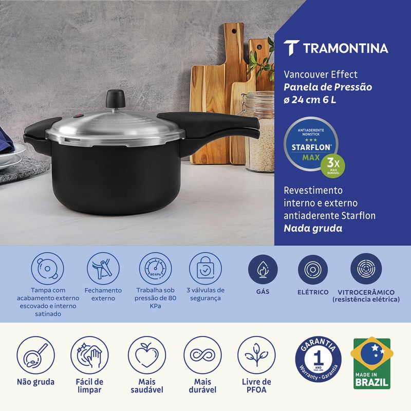 Torne suas refeições mais práticas com a Panela de Pressão Tramontina Vancouver Preta 6 Litros. Feita em alumínio de 3,2 mm, garante cozimento rápido e uniforme. O revestimento antiaderente Starflon Max evita que os alimentos grudem e facilita a limpeza. Possui tampa com vedação perfeita e alças antitérmicas que oferecem conforto e segurança. Compatível com fogões a gás, elétricos e vitrocerâmicos, é a escolha ideal para quem busca qualidade e praticidade na cozinha.