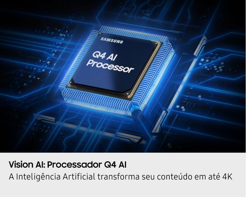Processador Q4 AI: inteligência em cada detalhe com a exclusiva tecnologia Vision AI, a TV otimiza qualquer conteúdo para resolução próxima ao 4K, garantindo imagens mais nítidas, brilhantes e cheias de vida.