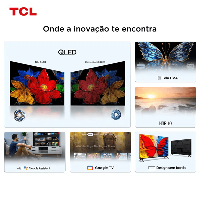 Imagem de alta definição e cores vibrantes. O painel QLED Full HD (1920 x 1080) entrega imagens nítidas, realistas e com brilho aprimorado, garantindo uma experiência visual de cinema em qualquer ambiente.