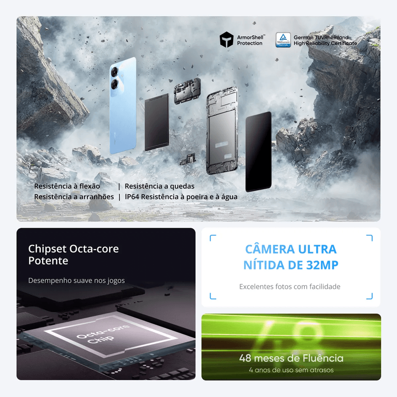 O Realme Note 60s foi desenvolvido para quem busca um smartphone completo, robusto e com ótimo desempenho no dia a dia. Construído com a tecnologia ArmorShell, ele combina estrutura em alumínio fundido com vidro reforçado, garantindo alta resistência contra quedas, riscos e respingos de água. Sua certificação IP64, aliada às rigorosas avaliações de durabilidade da TÜV Rheinland, reforçam sua confiabilidade em qualquer rotina ou ambiente de uso.