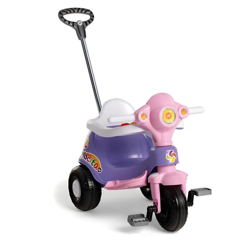 Na versão passeio, ele acompanha aro protetor, apoio de pés e empurrador com suporte para bolsa, garantindo segurança e conforto para os pequenos. O aro protetor possui acessórios didáticos coloridos e divertidos, estimulando a atenção e a curiosidade. Na versão pedal, basta remover os acessórios e os pequenos podem pedalar livremente, desenvolvendo coordenação motora grossa e equilíbrio.